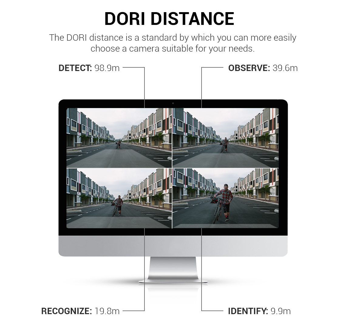 DORI (Detect, Observe, Recognize, Identify) is a standard (EN-62676-4) for assessing the ability of the camera to distinguish people or objects. Values do not reflect intelligent function distances.