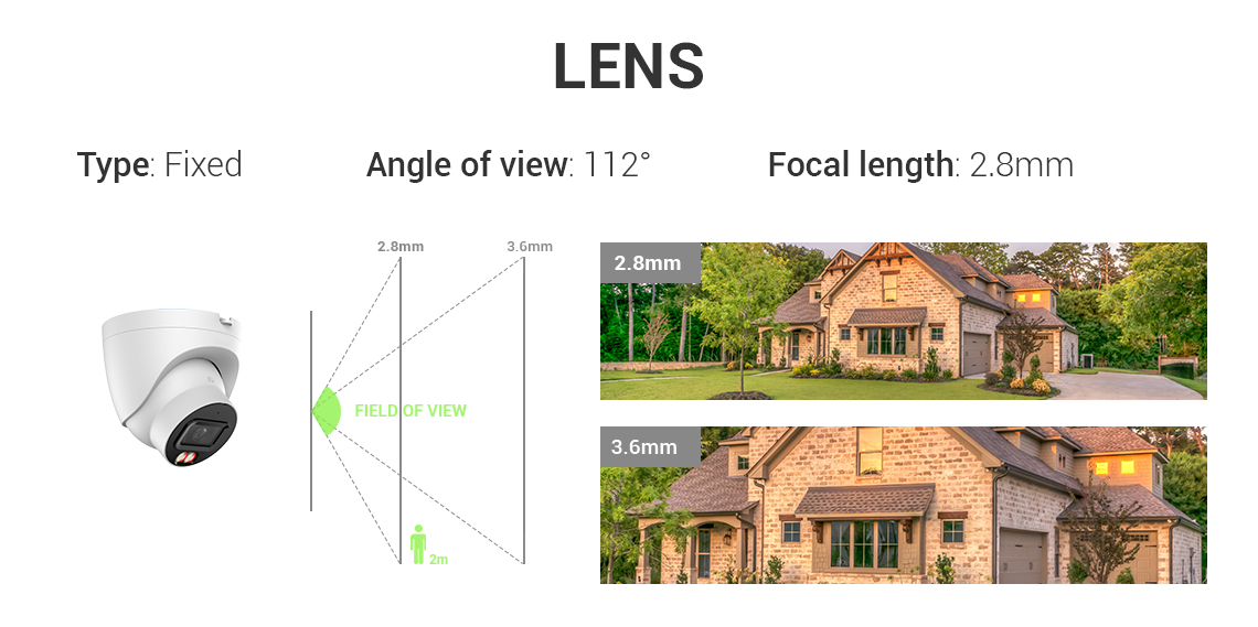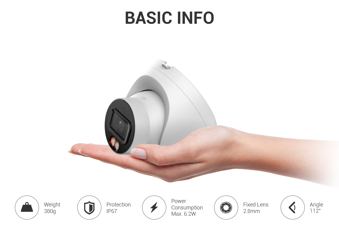 12Mp (4480 × 2512) - 15fps / Lens 112° / Min. Illumination: 0.008 LUX / IR LED range up to 30m / Power Consumption max. 6.2W / IVA (Tripwire, intrusion) / SMD plus