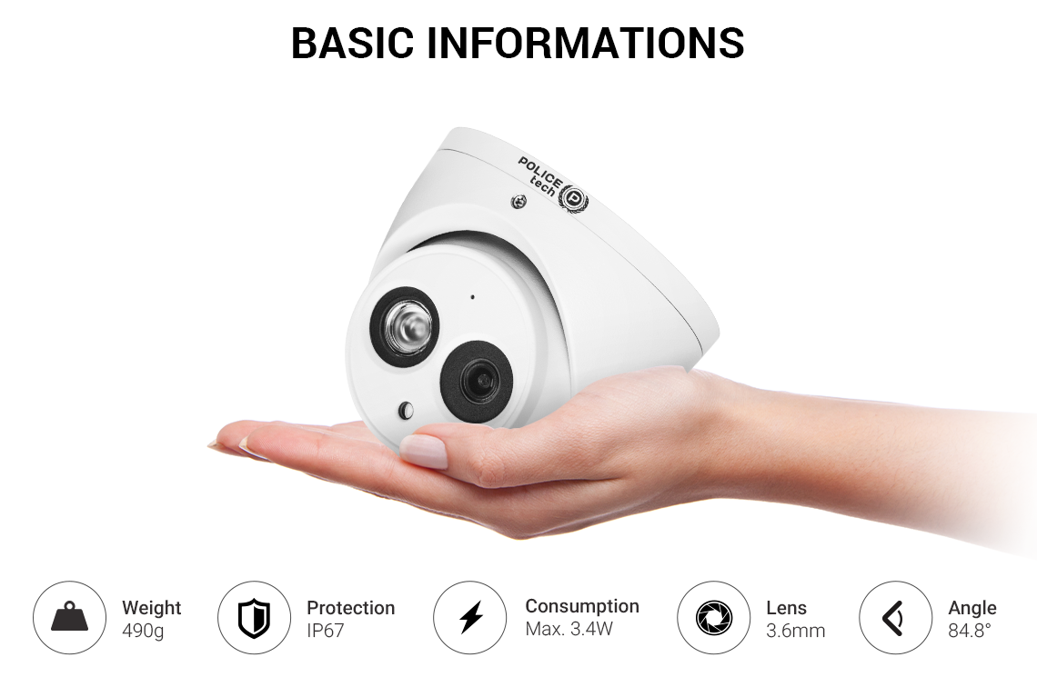 4Mp (2688x1520) - 30fps / Lens: 84.8° / IR LED range up to 50m / Min. Illumination: 0,03 LUX / Built-in Mic / HD/SD video output / Power Consumption 4,1W