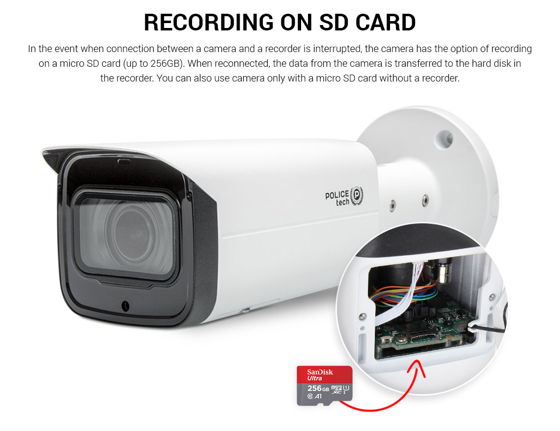 4Mp (2688×1520) - 20fps / Motorized Lens 104°–27° / Min. Illumination: 0.008 LUX / IR LED range up to 60m / Max. Power Consumption 9.6W / IVA (Tripwire, intrusion)
